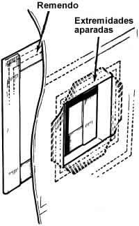 Na parte interna da barraca, apare a área danificada em forma de quadrado ou retângulo, aparando o mais próximo possível do rasgo. Corte os cantos 2,5 centímetros para dentro diagonalmente. Vire as extremidades cortadas para dentro 2,5 centímetros, prenda-as com alfinetes no lugar e faça uma costura superior próxima à extremidade ao redor de todo o furo. Faça novamente uma costura superior a uma distância de 3 a 6 milímetros da primeira fileira de costura e remova os alfinetes. Se desejar, faça costuras superiores adicionais como em uma almofada para reforçar o remendo. Finalmente, aplique um filete de selante de costura no perímetro do remendo na parte externa da barraca. Recoloque amarras, abas, janelas e zíperes rasgados da mesma maneira, formando telhas sobrepostas e aplicando selante de costura à emenda acabada. Remende telas rasgadas com um remendo ligeiramente maior que o rasgo ou furo, costurando ao redor de todas as extremidades com a sovela.