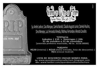 Nomes para a lista de desconto devem ser enviados ate as 16h do dia da apresentação para quandoosolhossefecham@yahoo.com.br. Todos os emails recebem confirmação