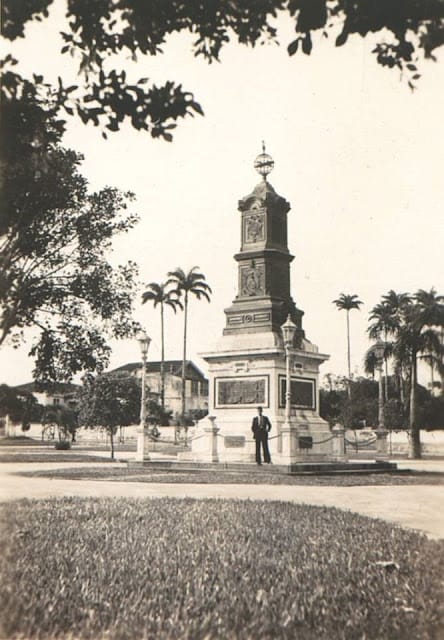 Foto Antiga São Vicente SP: (início do século) Imagem excepcional da Praça 22 de Janeiro (Biquinha), com o monumento do IV Centenário do Descobrimento Brasil, de Benedito Calixto, inaugurado em 1900.