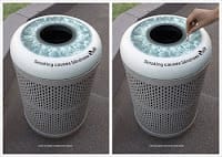 Nas proximidades dos restaurantes e pubs londrinhos sempre tem um cinzeiro público para evitar que os fumantes sujem as ruas. Eles foram usados como mídia nesta interessante campanha para a Quit, uma instituição sem fins lucrativos antitabagista. Nos cinzeiros foram colados um adesivo semi-transparente em forma de pulmão. Ficam à mostra, como se estivessem dentro do órgão, os restos dos cigarros. A agência Saatchi & Saatchi de Londres assume que criou a campanha acima para causar pânico nos fumantes.
