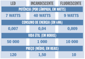 Como funcionam: LED é a sigla em inglês para diodo emissor de luz, material semicondutor com o qual se fabricam tais lâmpadas. Quando uma corrente elétrica percorre o diodo, ele é capaz de emitir luz. A vantagem dessas lâmpadas em relação às demais é que consomem menos energia e duram mais tempo (veja o quadro abaixo)