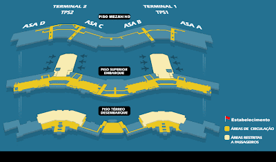Veja abaixo o mapa de localização dos Terminais e Asas no Aeroporto de Guarulhos – Cumbica