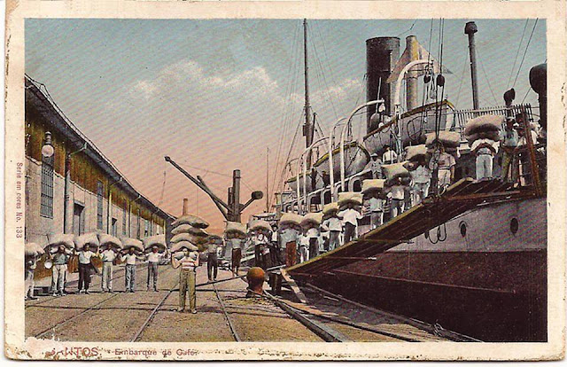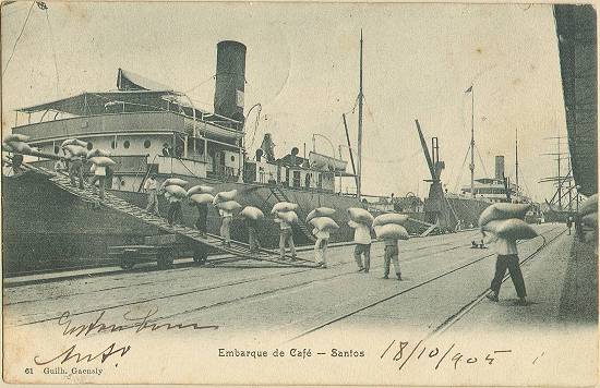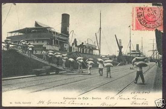 Nos primeiros anos do século XX, circulava em Santos este cartão postal sobre o embarque de café no porto santista. O exemplar foi datado de 18 de outubro de 1905: