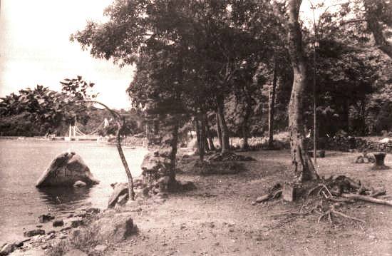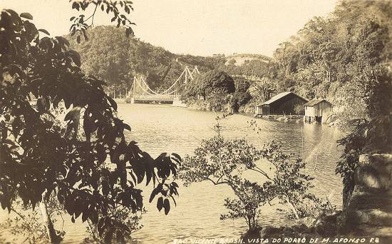 Cartão postal publicado pela empresa Wessel, em meados do século XX, vê-se a baía interna e a Ponte Pênsil, desde as ruínas do Porto das Naus. Acervo Francisco Carballa. Novo Milênio.