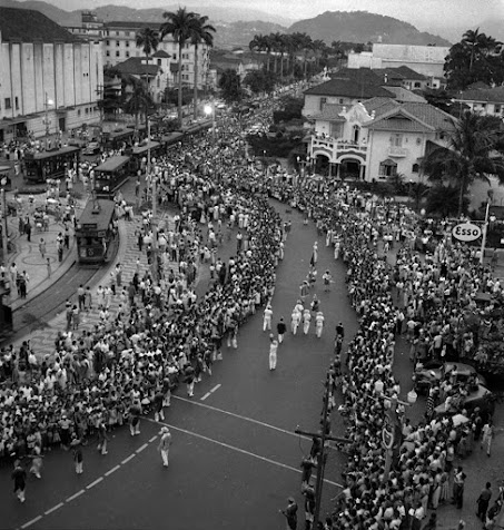 Desfile de Carnaval na Praça Independência em 1955 que lotou aquela região se estendendo por toda a Avenida Dona Ana Costa. Ali circulavam os bondes que levavam os blocos em torno da praça. Foto que faz parte do acervo iconográfico da Fundasantos Fams assinada pelo fotógrafo José Dias Herrera.