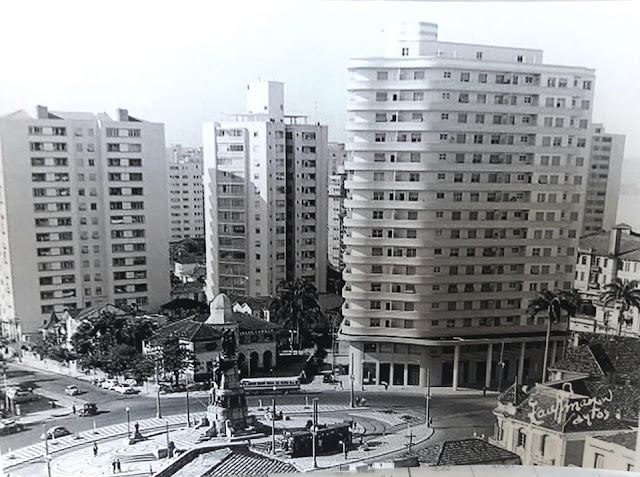 Foto Antiga Santos SP: Vista aérea da Pça. da Independência (1961). Na época ainda existia o Hotel Parque Balneário, o Cine Atlântico, a Confeitaria Yara. o Bar e o Café Atlântico. Os edifícios Olga e Aurora ainda em construção. Cartão-postal da Coleção: Laire. J. Giraud.