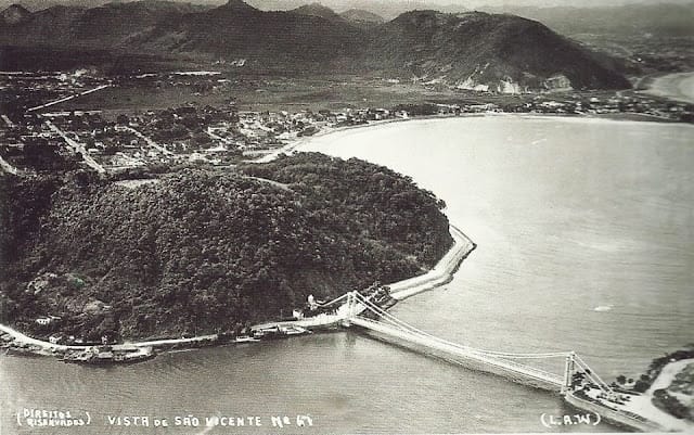Foto Antiga São Vicente SP: Ponte Pênsil e Bairro do Japuí (s.d).