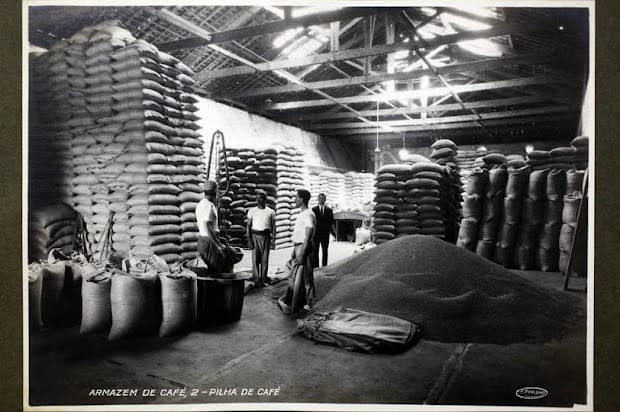 Armazém com máquina de beneficiamento de café, década de 1930. Fotografia e Fundo de Theodor Priesing. Acervo Museu do Café.