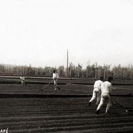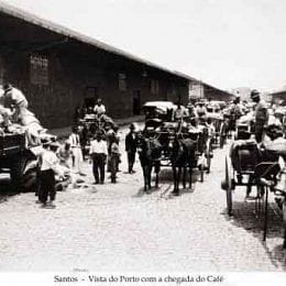 Carregamentos de café em carroças puxadas a burros no Porto de Santos. Fotografia e Fundo de Theodor Priesing. Acervo Museu do Café.