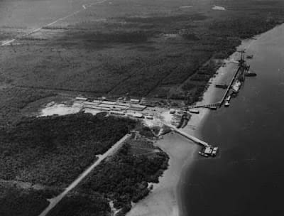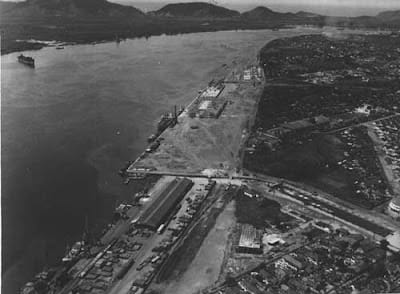 Vista aérea da construção do cais dos petroleiros, em 1956