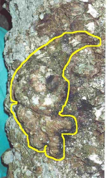 Fiquei curioso para ver o que era e fui me aproximando. Para meu espanto era um espírito da floresta, mais conhecido como Gnomo. Minha primeira reação foi pegar a máquina e fotografar o camaradinha, que estava se mechendo, mas mimetizado no tronco da árvore.