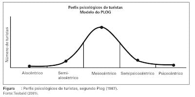 Plog (1987), citado por Wohlke (2005), sugere que no princípio do processo de desenvolvimento um espaço turístico é visitado por um número reduzido de “alocêntricos”, que sig-nificam para o autor turistas autoconfiantes e expansivos. Esses normalmente têm preferência por áreas não-turísticas, porque gostam de experimentar a sensação do descobrimento em áreas ainda não exploradas. Depois, quando o destino torna-se co-nhecido, passa a atrair um crescente percentual de “meso-cêntricos”. Então a destinação torna-se saturada e indivíduos psicocêntricos ocupam o espaço turístico. De acordo com Plog (1987), os psicocêntricos são turistas inibidos que preferem destinações familiares.