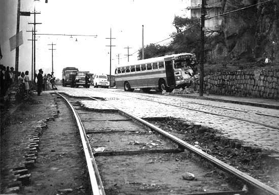 Foto Antiga Santos SP: (1958) Divisa Santos com São Vicente, acidente ônibus e visão dos trilhos do bonde.