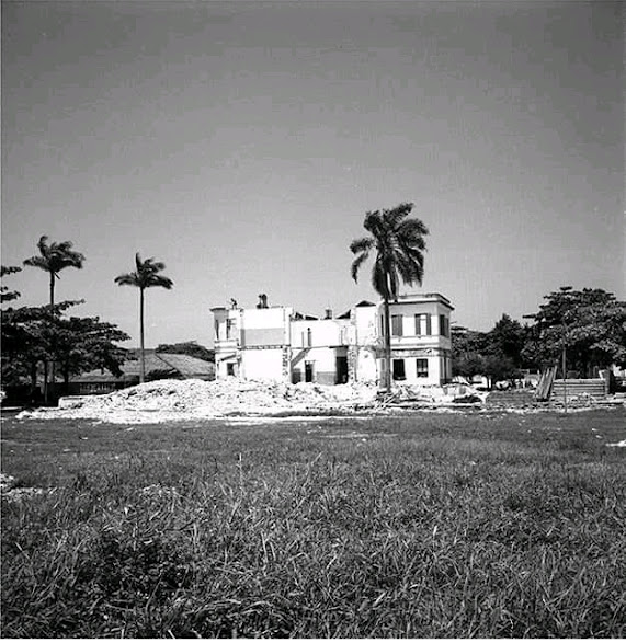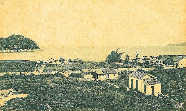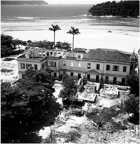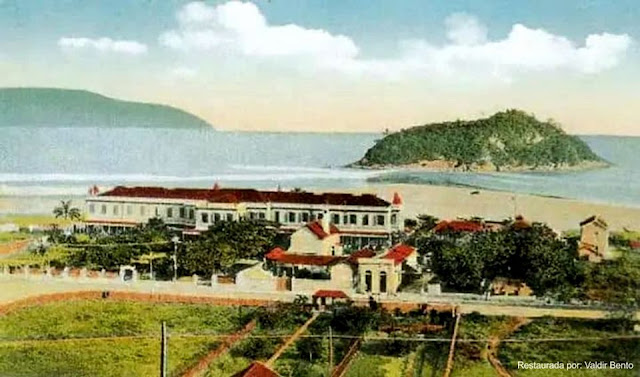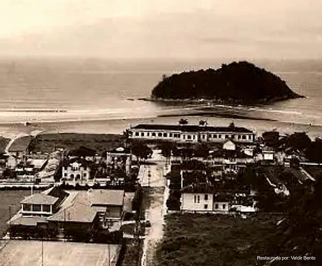 Início do século passado: Próximo a divisa. A esquerda a primeira estação de tratamento de esgotos, ainda existente no Orquidário. A direita, o Hotel Internacional, demolido e que veio dar lugar aos edifícios “pé na areia”. A esquerda também, a chácara que daria lugar ao Clube Caiçara, hoje também um condomínio. Ao centro o bonde que realizava o trajeto Santos- São Vicente.