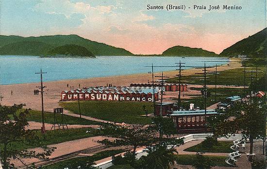 Foto Antiga Santos SP: Praia do José Menino (s.d.). Existem relatos que a faixa de areia das praias de antigamente possuíam muitos detritos pretos, acreditamos que isso seja devido a movimentação de navios no porto que eram movidos a carvão.