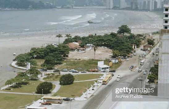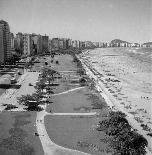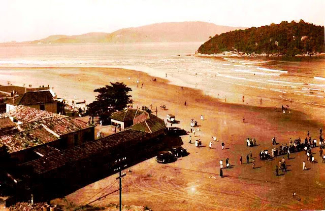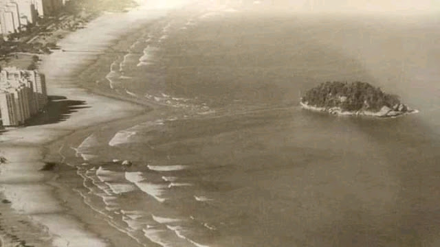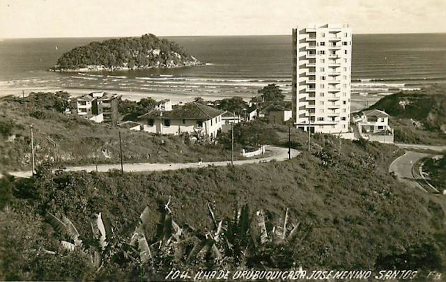 A foto é por volta da década de 1930 e mostra a Praia do Itararé com banhistas e alguns automóveis da época, tendo ao fundo a Ilha de Urubuqueçaba e algumas edificações onde hoje se situam alguns edifícios sobre as areias do Bairro do José Menino em Santos. O bucólico cenário e a ausência do emissário submarino são bastante evidentes.