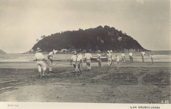 Foto Antiga Santos SP: Ilha do Urubuqueçaba e Pesca de Arrasto.