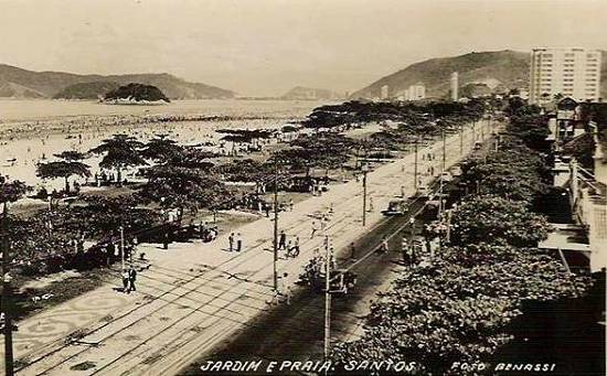 Ainda na década de 1940, a praia do José Menino, com uma pista para automóveis e as duas faixas para trilhos de bondes junto ao passeio da área ajardinada. Ao fundo, São Vicente.