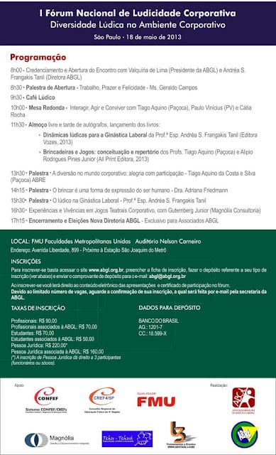 Todos estão convidadeos a comparer ao lançamento do livro “Dinâmicas lúdicas para os Programas de Ginástica Laboral” da Profª. Esp. Andréa Silva Frangakis Tani, pela Editora Vozes, o Lançamento acontecerá dentro do I Fórum Nacional de Ludicidade Corporativa, organizado pela (ABGL) Associação Brasileira de Ginástica Laboral e pela ABRE (Associação Brasileira de Recreadores).