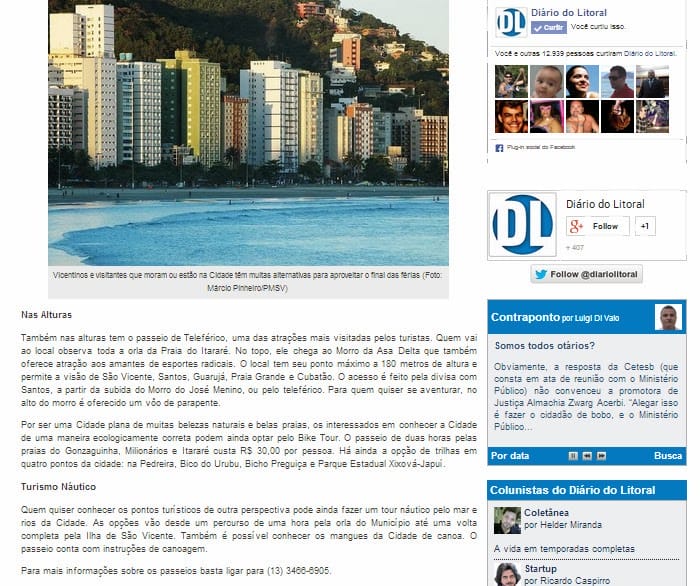 Vicentinos e visitantes que moram ou estão na Cidade têm muitas alternativas para aproveitar o final das férias. Além do maior espetáculo em Areia de Praia do Mundo, a Encenação da Fundação da Vila de São Vicente, que tem apresentação até o dia 26 deste mês, na Praia do Itararé, é uma das atrações à noite para quem vem a Cidade e durante turistas e moradores podem se divertir com diversos passeios.