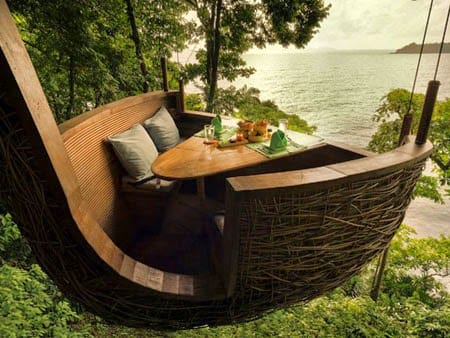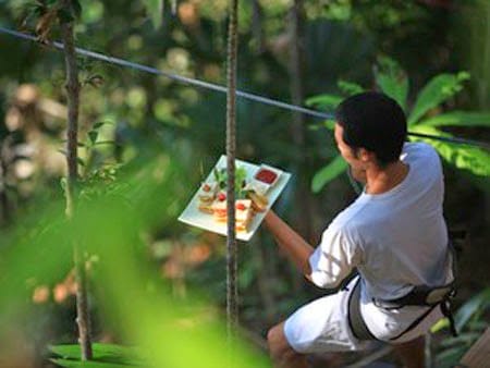 A refeição é feita a quase 5 metros de altura, no meio da copa das árvores. O garçom chega de tirolesa. Os vizinhos da mesa são esquilos e borboletas, e a vista é para o mar azul que banha as praias tailandesas.