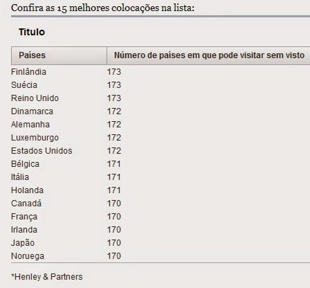 O estudo listou 219 países de acordo com regulamentos de vistos válidos desde 1 de julho de 2013. No topo dos países que menos precisam de vistos estão a Finlândia, Suécia e Reino Unido, todos com um total de 173 países.