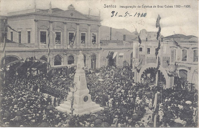 Cartão Postal Antigo Santos SP: Inauguração Estátua Braz Cubas. (1 de 2).
