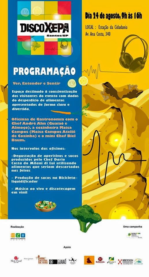 Festival Disco Xepa chega a Santos pela primeira vez Entre os objetivos do projeto está o alerta contra o desperdício de alimento O festival Disco Xepa, evento realizado pelo movimento Slow Food sobre Desperdício e Consumo Responsável, chega pela primeira vez em Santos, no dia 24 de agosto, na Estação da Cidadania. No Brasil, a campanha é do Slow Food Youth Brasil e a iniciativa é do Banco de Alimentos de Santos.
