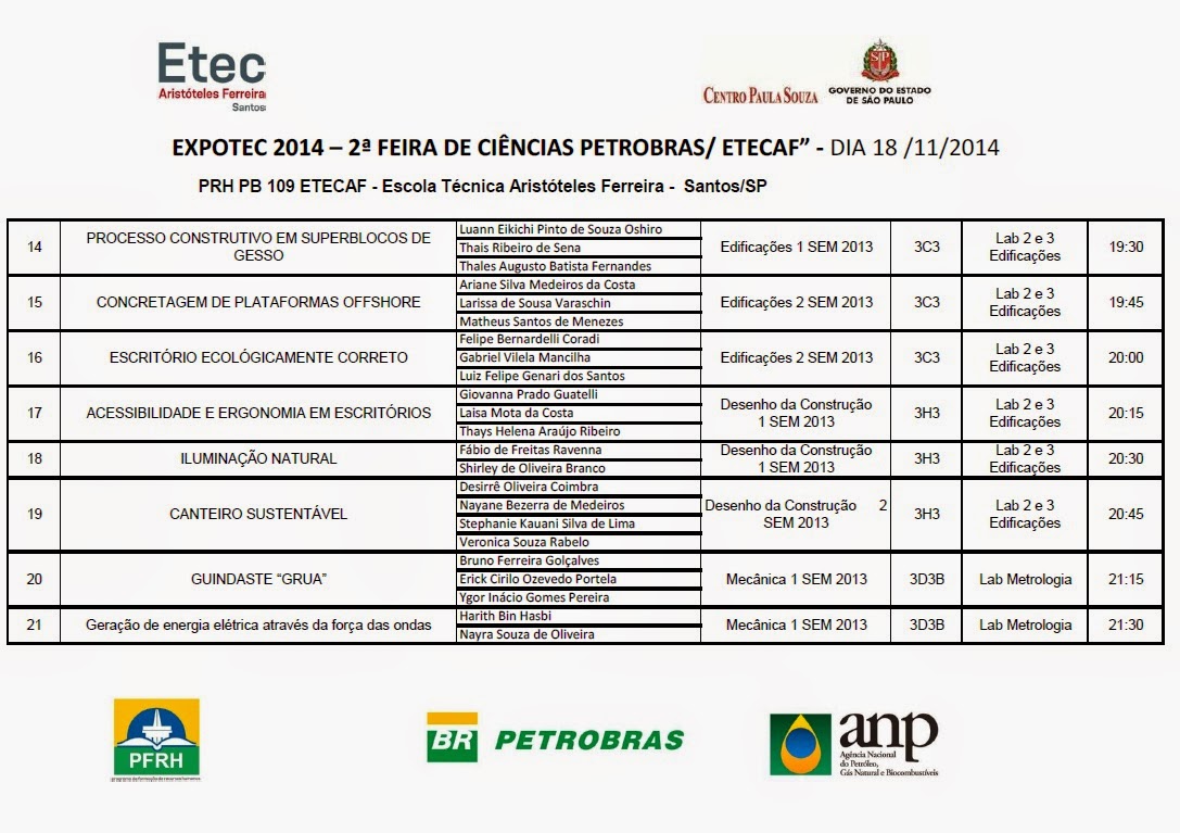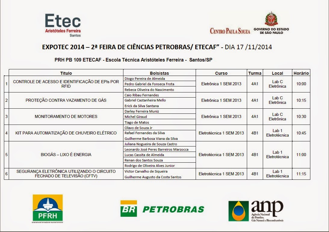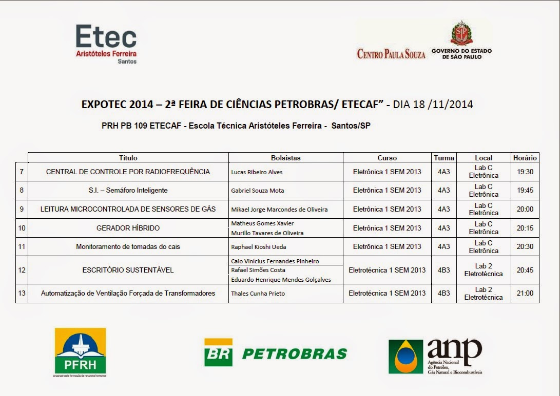 Nos dias 17 e 18 de novembro acontece a Expotec 2014, a 2ª Feira de ciências Petrobras/ETECAF – PRH PB 109. A atividade é parte da comemoração dos 45 anos da ETEC Aristóteles Ferreira.