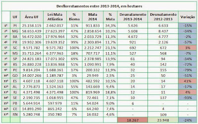 A tabela a seguir indica os desflorestamentos, em hectares, somente das florestas nativas (sem contar outras classes, como vegetação de mangue e restinga), observados no período 2013-2014, com comparativo e variação em relação ao período anterior (2012-2013):