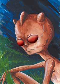Com veias arroxeadas e saltadas à altura das espáduas, com longos e finos braços e pés enormes, traz na caixa craniana avantajada três protuberâncias, dando a impressão de chifres.As três garotas gritam e disparam em direção à sua residência, onde chegam em prantos e em pânico.