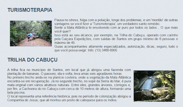 Lugares convidativos na Trilha do Cabuçu. A trilha fica no município de Santos, em local que já abrigou uma fazenda com plantação de bananas. O passeio, ida e volta, leva umas seis agradáveis horas.