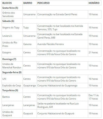 Os blocos de arrasto começarão a agitar a Cidade na sexta-feira (5) e encerram na terça-feira (9). No Cibratel, acontecerão apresentações musicais na Arena do Festival Pé Na Areia de domingo (7) a terça-feira (9), às 16 e às 18 horas.