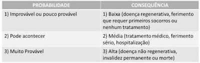 Todo Perigo identificado tem uma Probabilidade de ocorrer, assim como todo Risco gera uma Conseqüência, ou seja, Perigo => Probabilidade e Risco => Conseqüência, conforme a tabela 2.