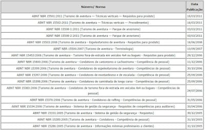 Atualmente existem 17 normas publicadas relacionadas ao Turismo de Aventura, como se encontra na tabela abaixo: