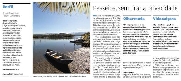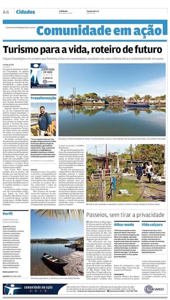 Matéria sobre Turismo Comunitário – Página A6 – Jornal a Tribuna 13/07/2016. “Turismo para a vida, roteiro de futuro” com Renato Marchesini