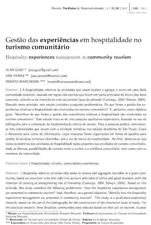 A gestão das experiências em hospitalidade no turismo comunitário.