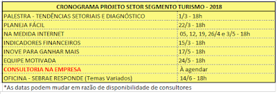 A exemplo de 2017 o Sebrae-SP irá acompanhar 20 empresas prestadoras de serviços turísticos através de cursos, palestras e workshops sobre finanças, marketing, administração e gestão de pessoas. Serão 43 horas de atendimento totalmente dedicadas à sua empresa, além da interatividade criada no grupo. Gostaria de mais informações ? Clique em http://bit.ly/SSBS2018 , ou entre em contato pelo fone (13) 3208-0010.