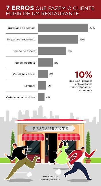 A qualidade da comida é o ponto crucial de um restaurante, tanto que aparência e temperatura do prato, falta ou excesso de tempero e o ponto de cozimento errado representam 37% dos problemas. Um sorriso receptivo, atenção, cordialidade, agilidade e apresentação pessoal também são muito valorizados – tanto que o mau atendimento é responsável por 29% das inconsistências.