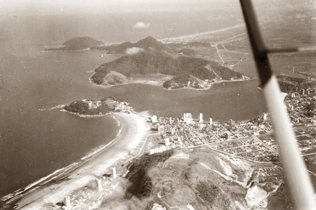 Foto Antiga São Vicente SP: (1956) Praia do Itararé, Ilha Porchat, Praia do Gonzaguinha, com Parque Estadual Xixóvá Japuí e Praia Grande ao fundo.