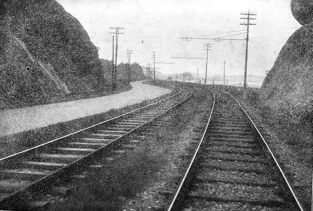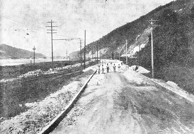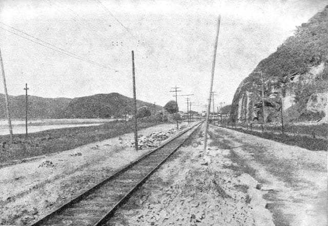 Foto Antiga São Vicente SP: Avenida Manoel da Nóbrega (s.d.). Ao lado direito a pedra do ladrão que foi dinamitada. Divisa / Praia do Itararé.