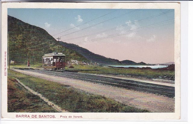 Cartão Postal Antigo São Vicente SP Praia do Itararé, Bonde, Morro da Ilha Porchat (s.d.). Foto tirada da Rua da Constituição (aparece os trilhos do trem). Arquivo Laire Giraud.