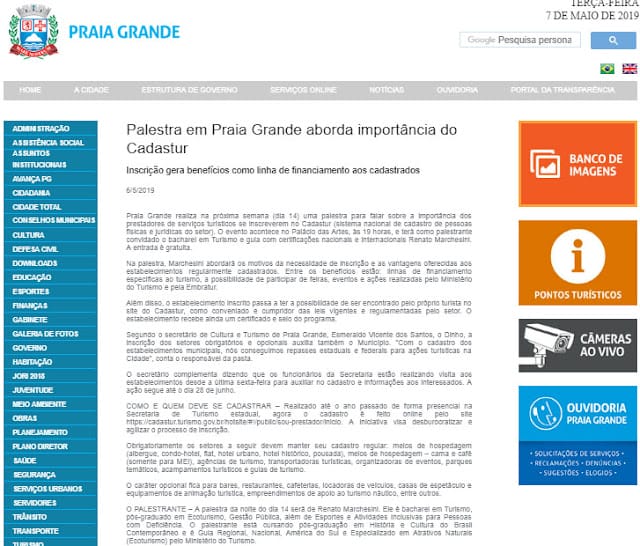 Praia Grande realiza na próxima semana (dia 14) uma palestra para falar sobre a importância dos prestadores de serviços turísticos se inscreverem no Cadastur (sistema nacional de cadastro de pessoas físicas e jurídicas do setor). O evento acontece no Palácio das Artes, às 19 horas, e terá como palestrante convidado o bacharel em Turismo e guia com certificações nacionais e internacionais Renato Marchesini. A entrada é gratuita.