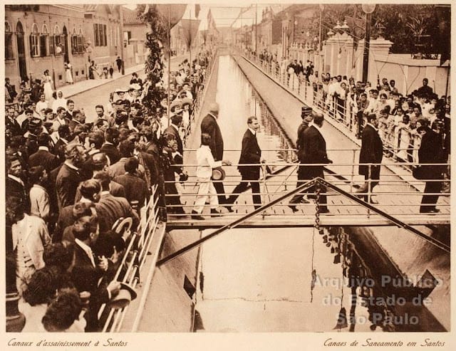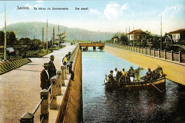 Santos, de clima quente e úmido, construída sobre terrenos de antigos mangues e rodeada por áreas pantanosas tinha todas as condições favoráveis para o desenvolvimento de graves epidemias. “Entre 1889 e 1897 morria-se em Santos mais do que nascia-se” Uma das obras sanitárias mais importantes para Santos foi a abertura dos canais de drenagem pluvial.