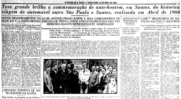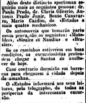 “Decididamente ousada iniciativa do dificílimo raid automobilistico Rio-S.Paulo. Se os caminhos estiverem em boas condições, os excursionistas pretendem chegar a Santos ao anoitecer de hoje”, escreveu o Estado no dia da partida.