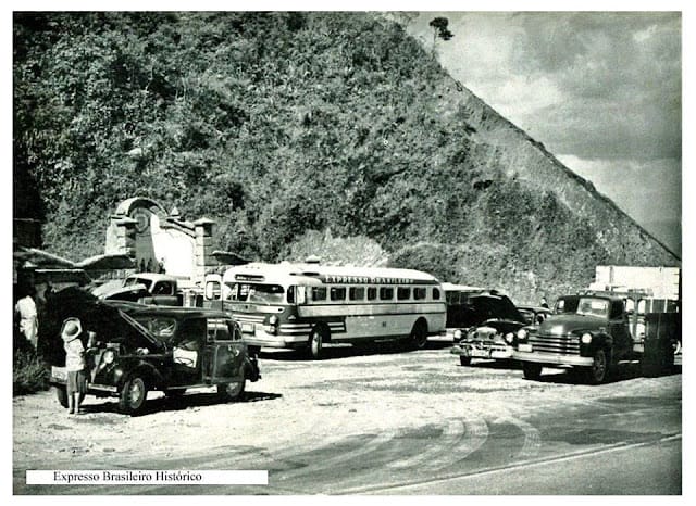 Foto Antiga Rodovia Anchieta Parada da bica na Rodovia Anchieta no início dos anos de 1950. Ônibus Expresso Brasileiro.