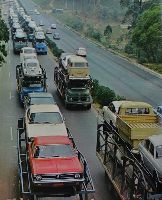 Foto Antiga Rodovia Anchieta (1971) próximo a um feriado. Anos em que uma viagem a praia era um acontecimento de uma alegria constante. Nesses tempos a única preocupação era a temperatura dos motores dos veículos. Nada que não pudesse ser resolvido com água fresca das bicas nos radiadores ou um pano molhado nas bobinas dos Volkswagens. Foto Coleção: Claudio Sterque