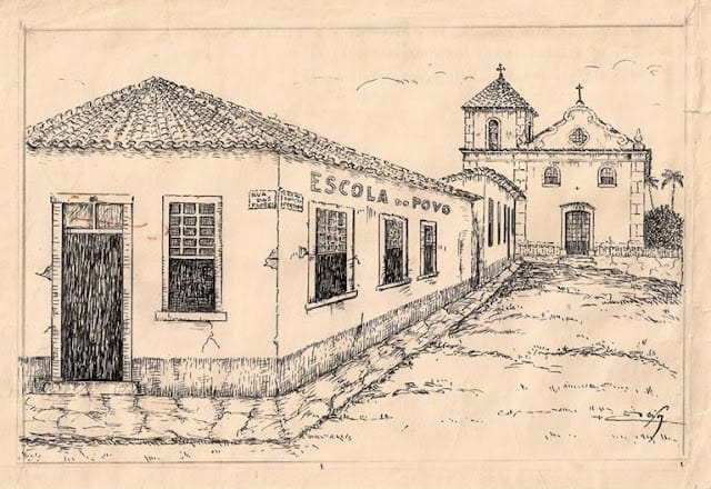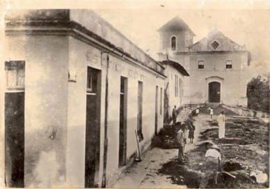 Foto Antiga São Vicente SP: Igreja Matriz ao fundo, 1ª Escola do Povo (Grupão), então na esquina rua das flores (hoje Djalma Dutra), com Lareo Batista Pereira (hoje Praça João Pessoa).