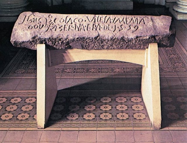 Pedra Frontal da Antiga Igreja Matriz de São Vicente SP, datada de 1559 e reconhecida como a mais antiga pedra de inscrição religiosa do Brasil. O artefato é um frontispício, elemento da entrada principal da segunda edificação da Igreja Matriz de São Vicente Mártir, datada de 1559 e construída a pedido de Pero Colácio Vilela. Depois de a Igreja ser atacada e destruída, a pedra desapareceu, sendo encontrada somente em 1880 durante reformas no entorno da construção da atual Igreja Matriz. Aos cuidados de Benedito Calixto, a peça foi doada para o Museu Paulista da USP (Museu Ipiranga) em 1917.