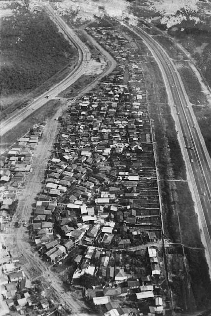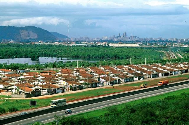 Foto Antiga Cubatão SP: Vista aérea da Vila Socó (s.d.) antes do incêndio que a destruiu parcialmente em 1984. A esquerda está a via Bandeirantes e a direta a Rodovia Anchieta.